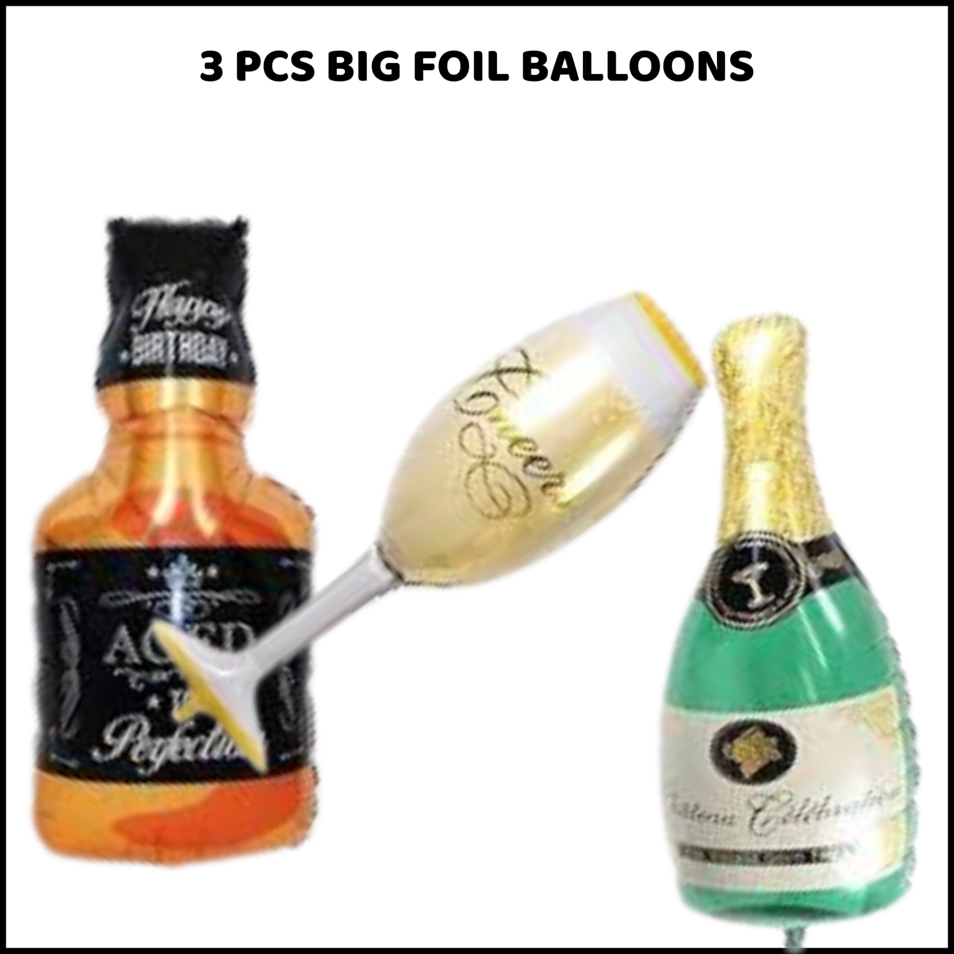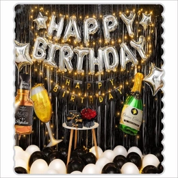 The shimmering black foil curtain backdrop, glowing warm lights, and stylish silver “Happy Birthday” foil letter balloons create a rich, Instagram-worthy look. Decorative elements like champagne bottle foil balloons, wine glass foil, silver star balloons, and a classy balloon floor arrangement add a luxury party vibe—ideal for night celebrations and surprise setups.