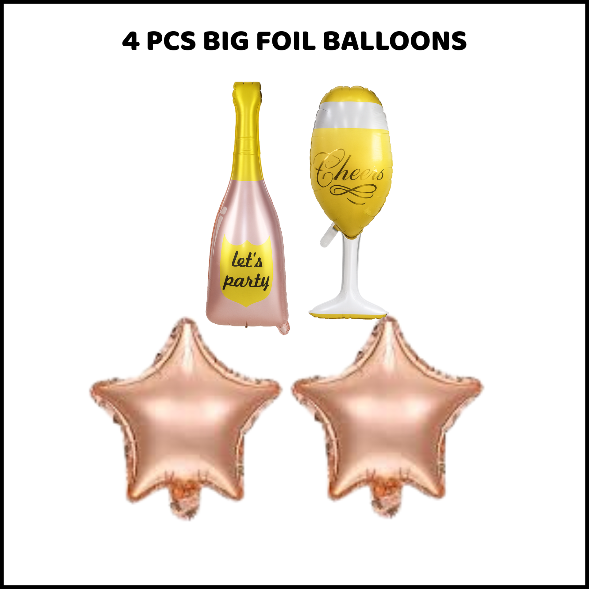This premium DIY party decoration combo includes rose-gold foil curtains, pastel pink & white balloons, gold star foil balloons, a rose-gold Happy Birthday foil banner, confetti balloons, champagne & cheers foil balloons, LED cork lights, and complete setup accessories.