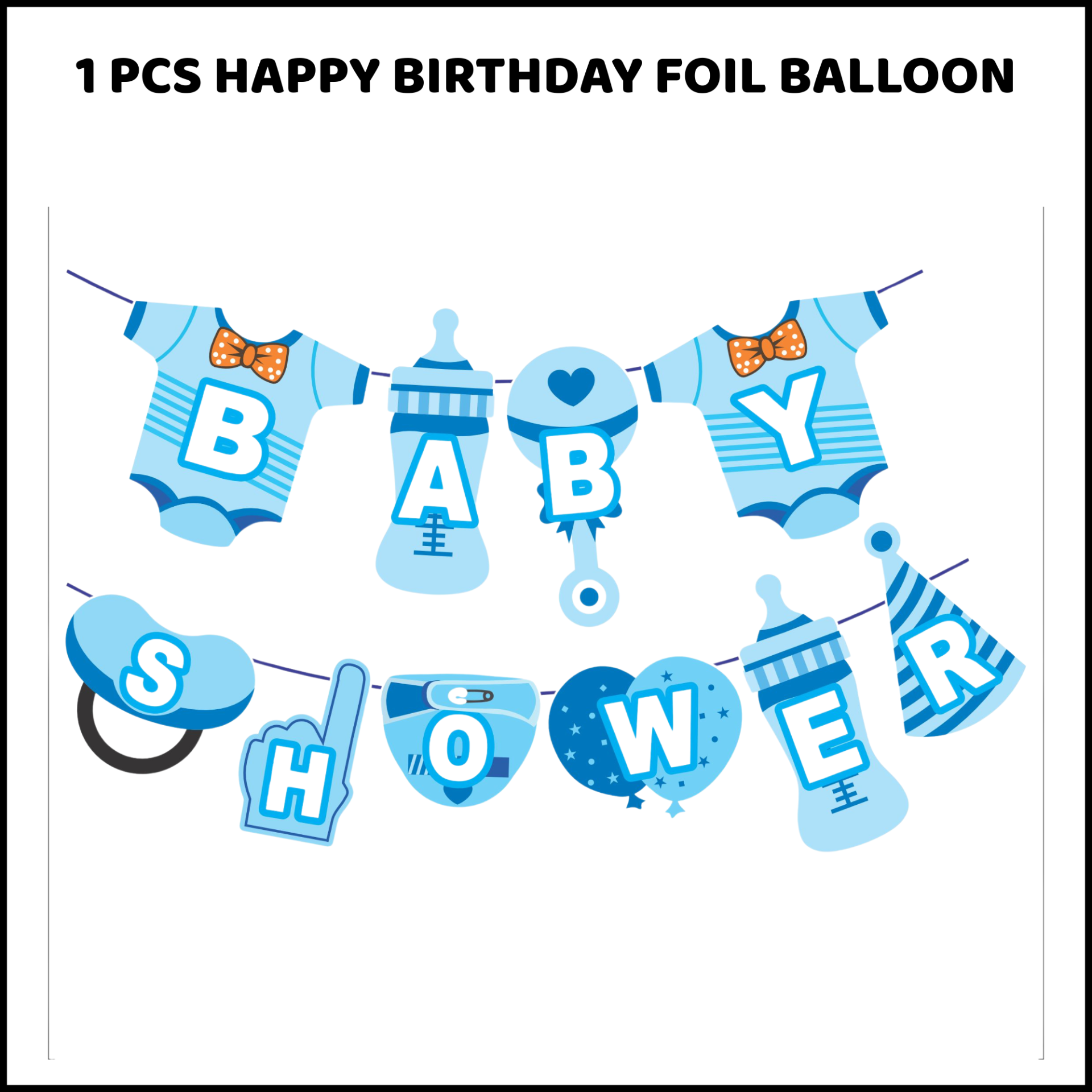 Blue and golden star foil balloons add sparkle, while the Baby Shower banner, confetti balloons, and big foil balloons complete the décor beautifully. Fun party accessories like birthday sash, LED cork lights, curl candles, party poppers, balloon pump, and birthday goggles make the celebration exciting, interactive, and memorable for family and guests.
