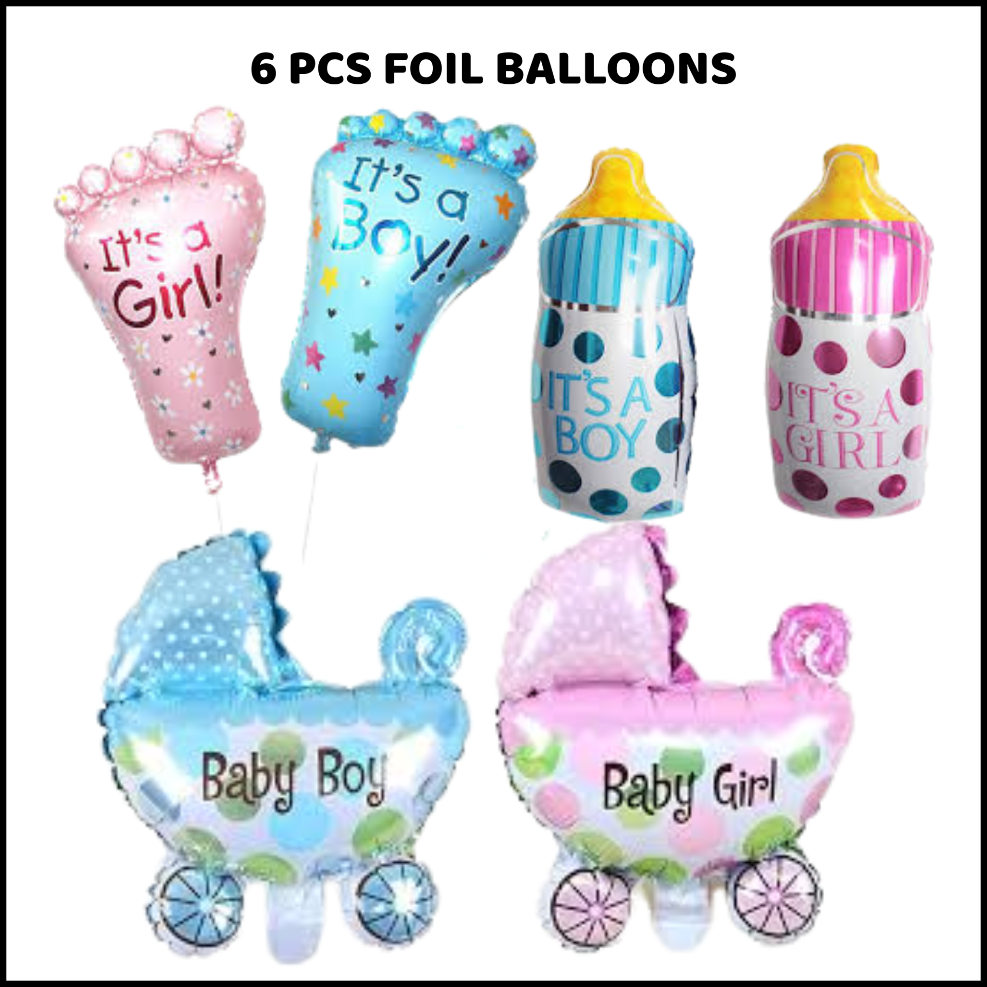 4. 6 PCS Baby-Themed Foil Balloons (Bottle, Carriage, Baby Boy & Baby Girl)