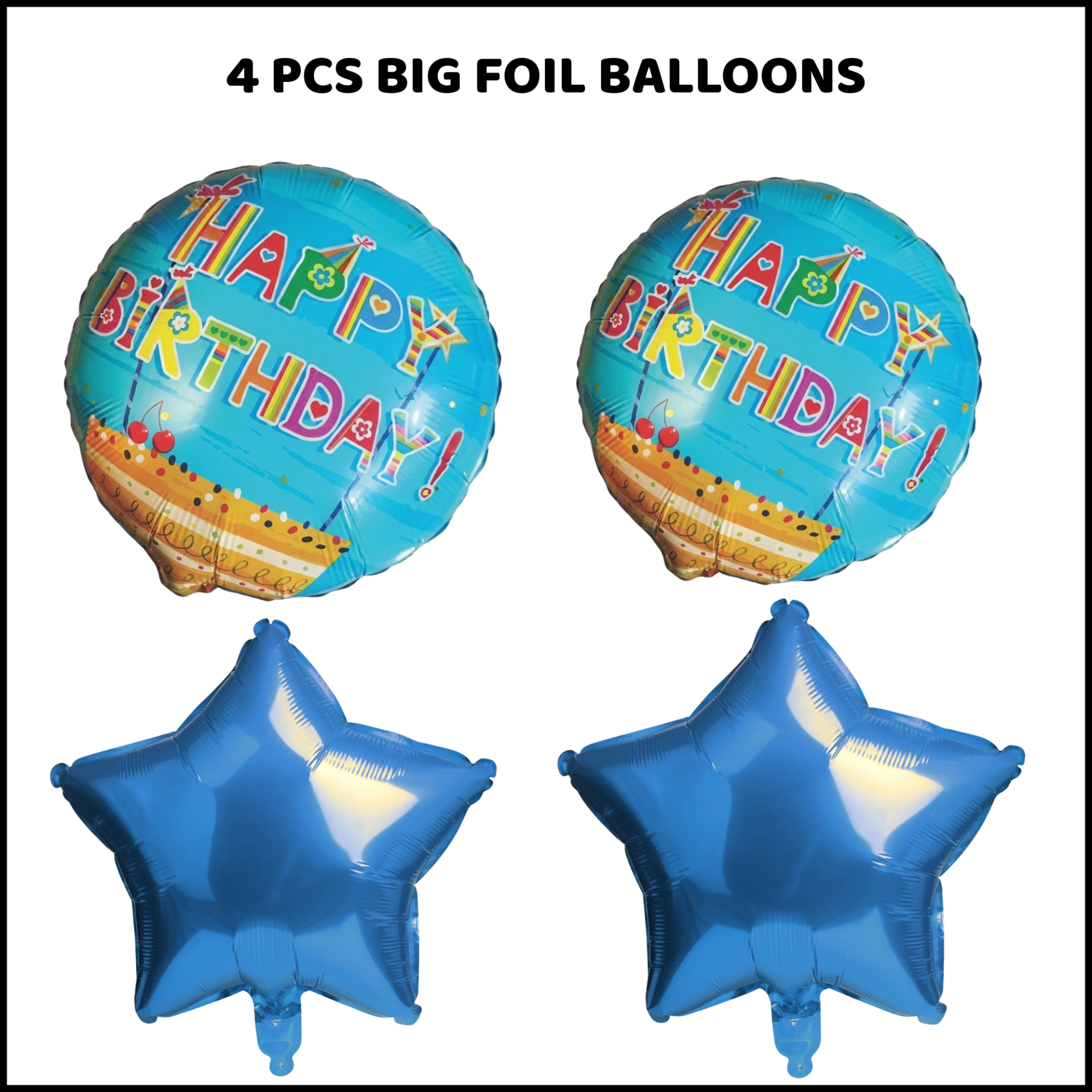 This complete birthday decoration kit includes blue foil curtains, blue & white balloons, star foil balloons, big theme foil balloons, confetti balloons, birthday banner, balloon arch tape, glue dots, curl ribbons, poppers, curl candles, balloon pump, Doremon foil balloon, birthday sash, cork lights, birthday caps, and birthday goggles, giving your setup a premium, festive, and Instagram-worthy look.