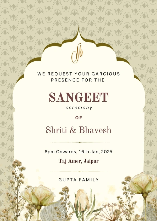 This design reflects grace, music, and togetherness—making it ideal for a Sangeet ceremony, where joy, dance, and family bonding come together. Its minimal yet premium aesthetic makes it suitable for digital invitations, WhatsApp sharing, and high-quality printed cards.