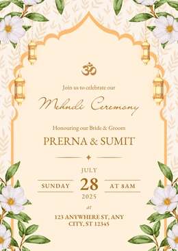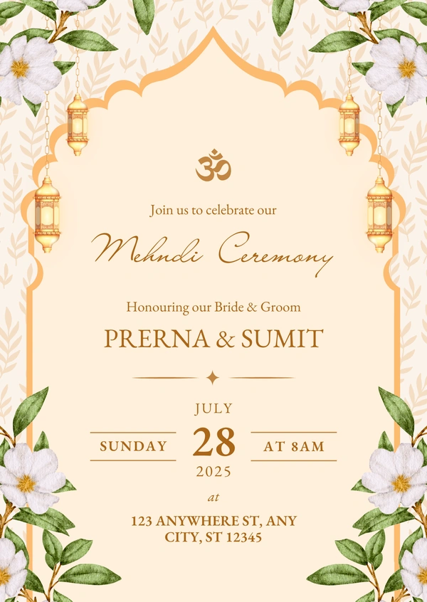 A beautifully designed floral Mehndi ceremony invitation featuring traditional Indian motifs, soft pastel colors, hanging lanterns, and an auspicious Om symbol. Ideal for pre-wedding celebrations with a graceful and premium look.