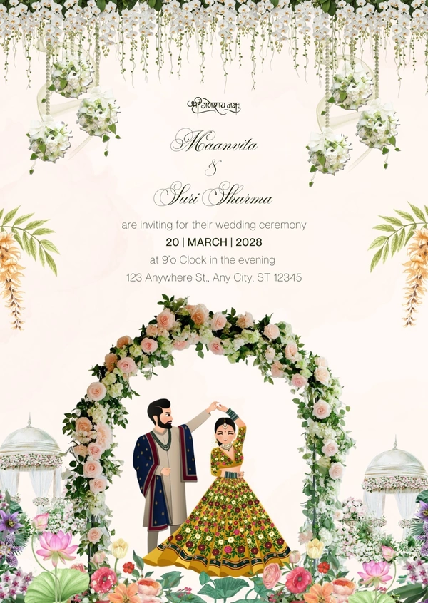 This invitation showcases a charming illustrated Indian couple dancing under a lush floral arch, symbolizing love, joy, and togetherness. Soft pastel tones, hanging white orchids, and classic floral arrangements create a serene and luxurious feel.