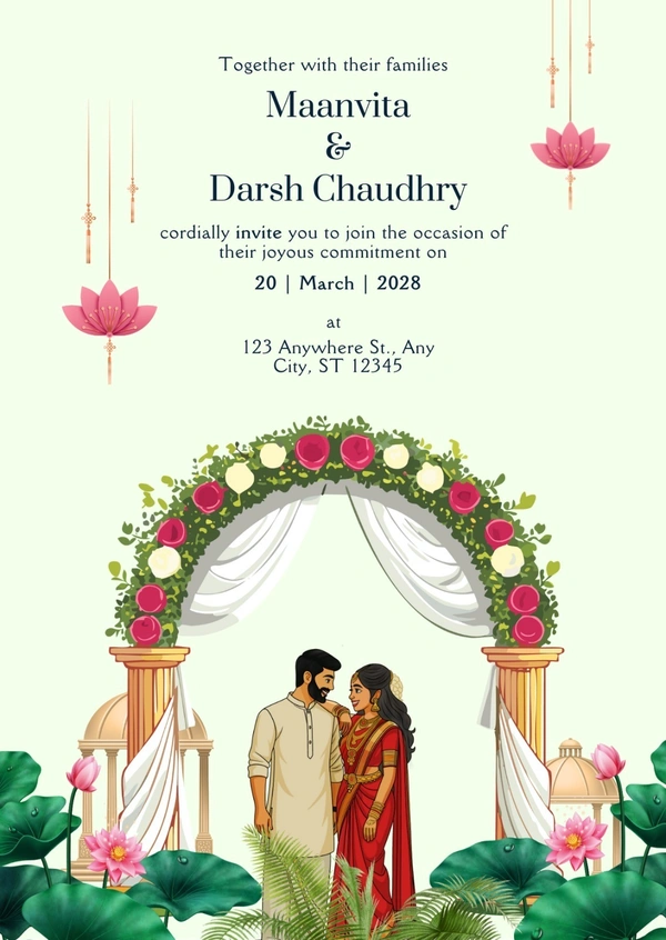 A refined Indian wedding invitation featuring an illustrated bride and groom standing beneath a floral mandap, blended with soft pastel tones and lotus accents for a graceful and auspicious look.