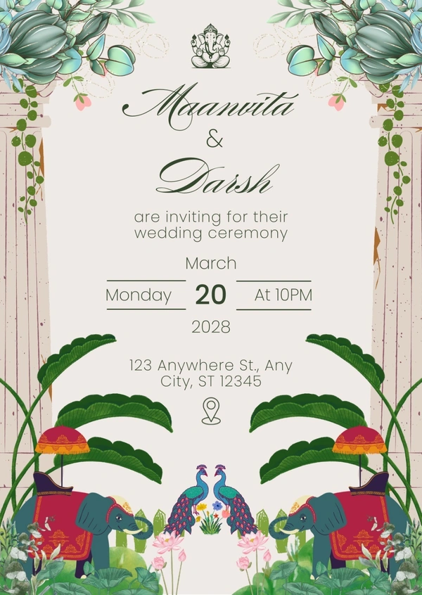 A sophisticated Indian wedding invitation featuring Lord Ganesh, botanical arches, peacocks, and royal elephant motifs—perfect for a serene, cultural, and premium wedding celebration.