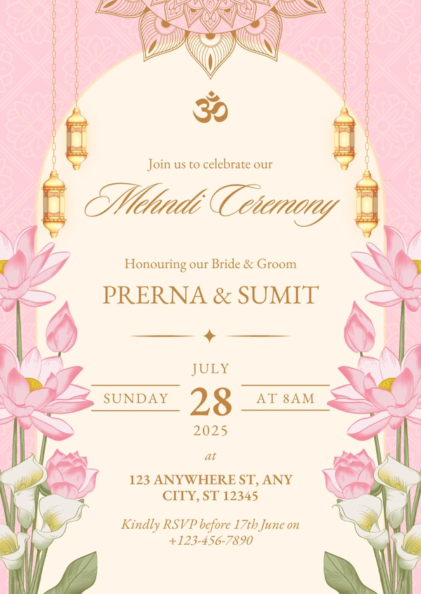 A graceful Mehndi ceremony invitation featuring soft pink tones, lotus flowers, golden lanterns, and a traditional Indian arch layout. Perfect for a serene, classy, and culturally rich pre-wedding celebration.