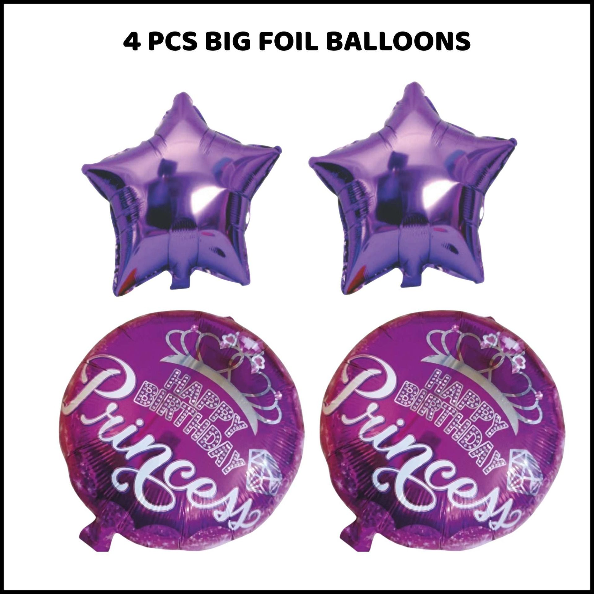 The shiny gold foil curtain combined with purple & gold balloons, purple star foil balloons, and Princess-themed round foil balloons creates a rich and magical party atmosphere. The matching purple Happy Birthday banner adds charm, while accessories like cork lights, poppers, curl candles, caps, and goggles bring fun, sparkle, and photo-perfect moments to the celebration.