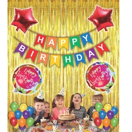 The elegant gold foil curtain paired with red & gold balloons, star foil balloons, and round Happy Birthday foil balloons instantly transforms any room into a festive celebration zone. The bright red Happy Birthday banner adds a classic party vibe, while accessories like cork lights, poppers, candles, caps, and goggles make the celebration more fun and interactive.