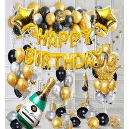 The combination of gold foil star balloons, champagne bottle foil, crown foil balloon, metallic gold & black balloons, confetti balloons, and golden “Happy Birthday” foil letters gives your setup a rich, elegant look. The kit also includes lights, poppers, ribbons, candles, and accessories to complete the celebration.