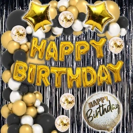 This DIY birthday decoration set includes black foil curtains, black & gold balloons, gold star foil balloons, premium “Happy Birthday” gold foil letter balloons, confetti balloons, cork lights, candles, poppers, ribbons, caps, goggles, and all essential setup accessories.
