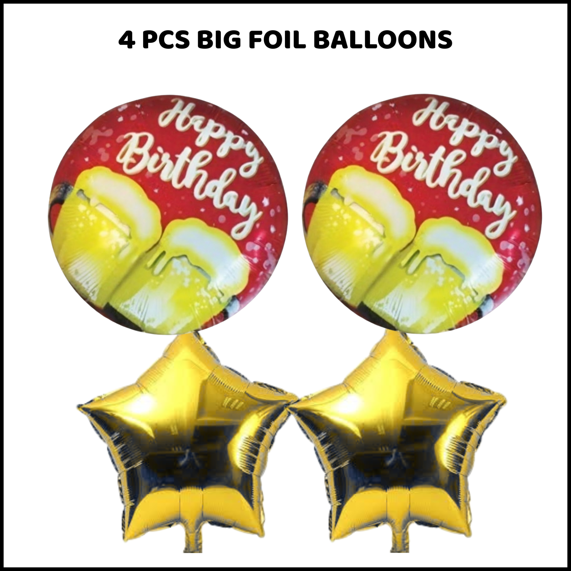 This premium DIY birthday decoration set includes red foil curtains, red & gold balloons, gold star foil balloons, happy birthday foil letter balloons, confetti balloons, cork lights, candles, poppers, ribbons, caps, goggles, and all essential installation accessories.