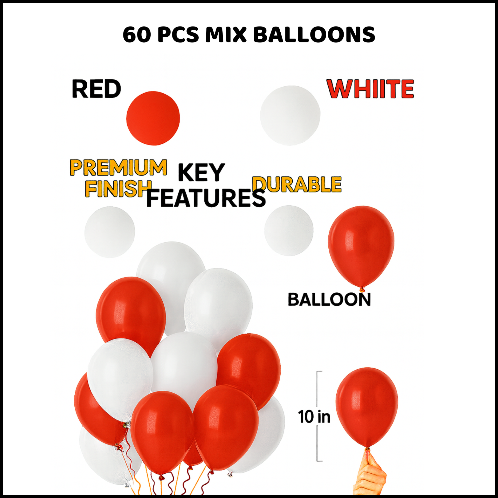 • All-in-one decoration set for quick DIY setup • Theme décor: LOVE for a photo-ready birthday setup • Color theme: Red, White • Includes: Glue dots, Heart foil balloons, Foil balloons, Birthday candles • Best for: Room, Hall, Photo backdrop • Easy to install at home and creates a premium party look in minutes