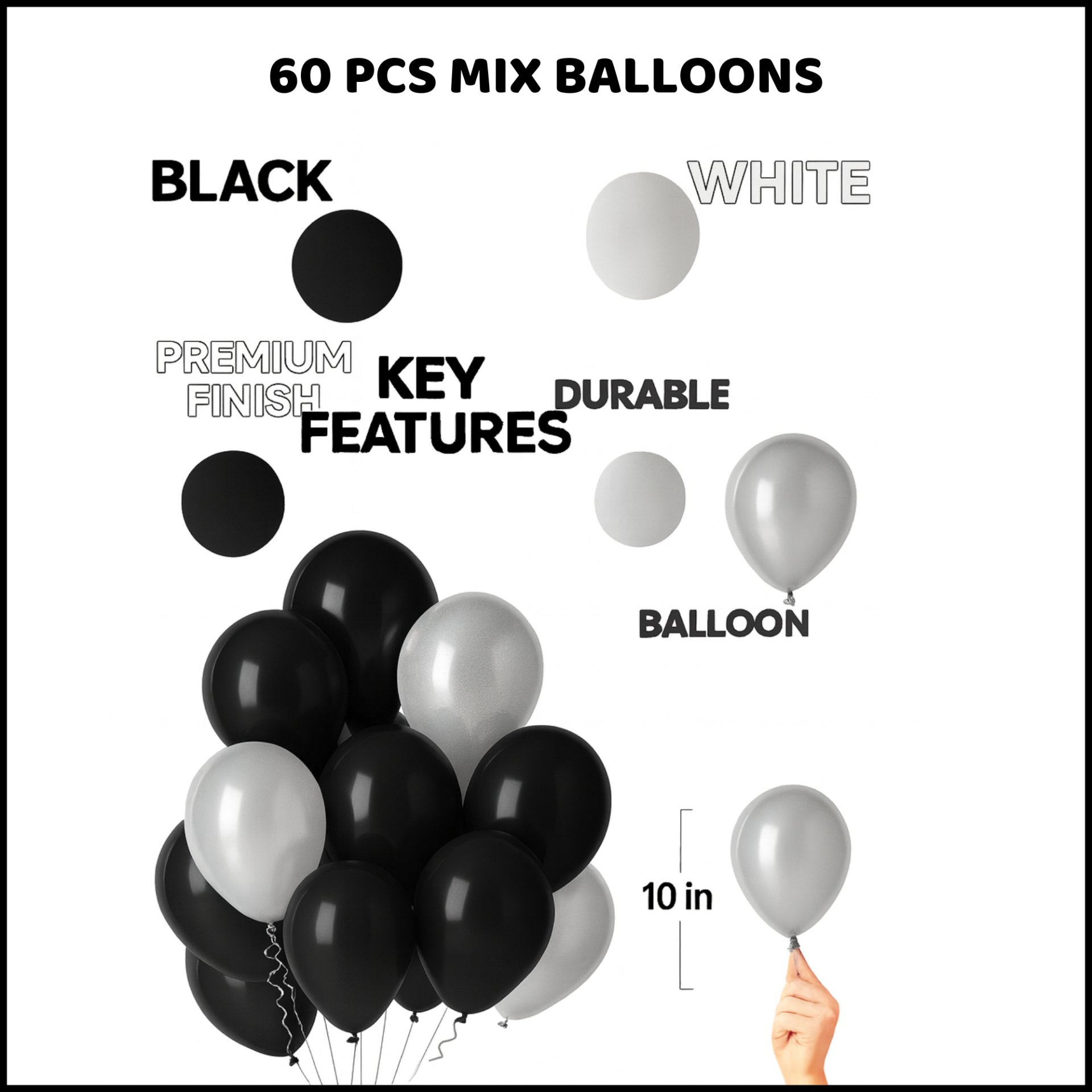 • All-in-one decoration set for quick DIY setup • Theme décor: Luxury Black White for a photo-ready birthday setup • Color theme: Red, Silver, Black, White • Includes: Glue dots, Heart foil balloons, Foil balloons, Birthday candles • Best for: Room, Hall, Terrace, Photo backdrop • Easy to install at home and creates a premium party look in minutes