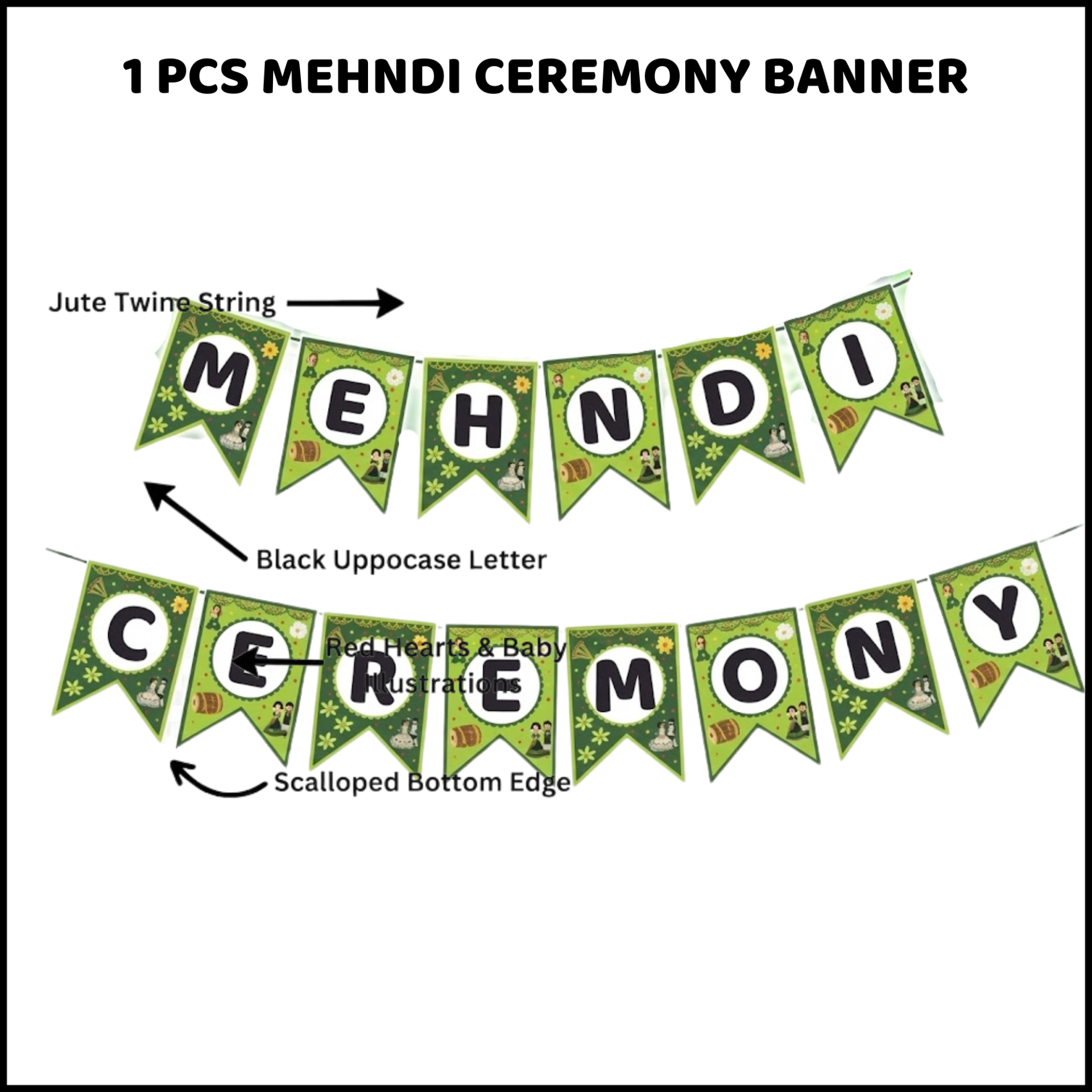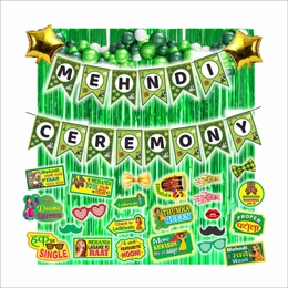 The kit features premium green foil curtains, gold star foil balloons, green & dark green latex balloons, confetti balloons, and a beautifully designed “Mehndi Ceremony” banner that instantly enhances your décor.