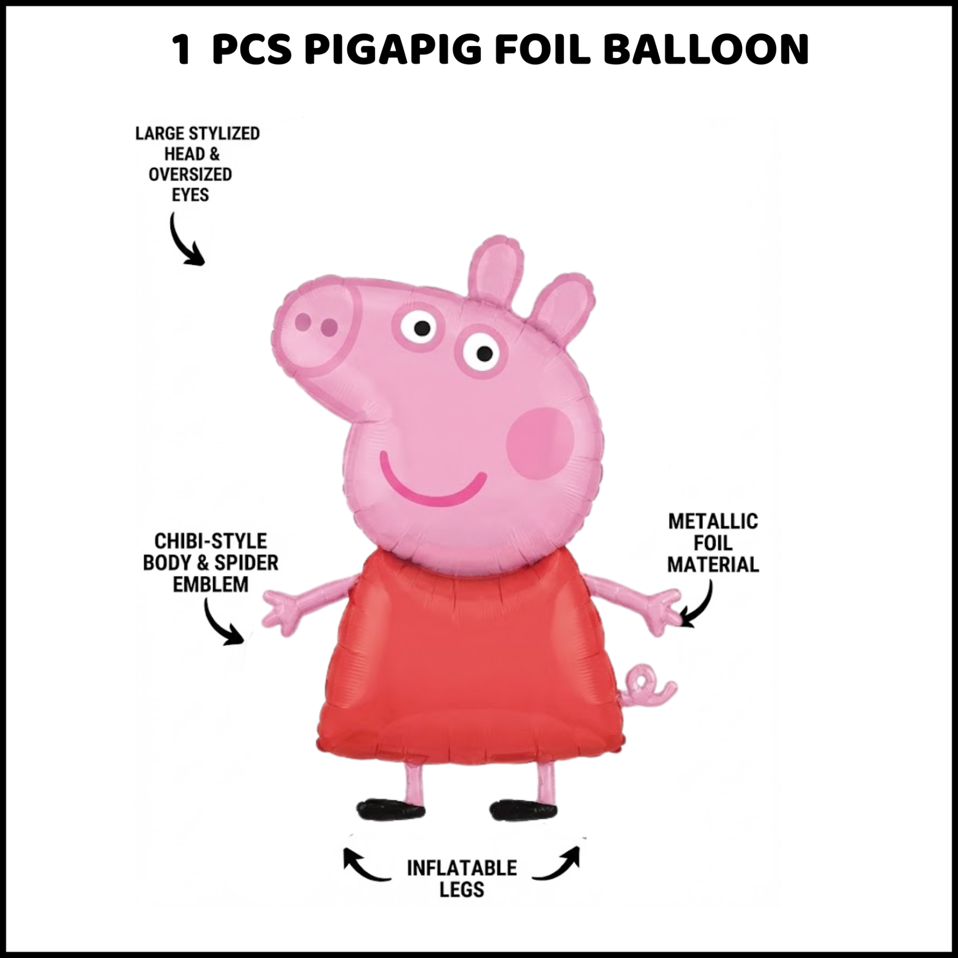 The kit includes red & white balloons paired with shimmering red foil curtains, creating a bold and festive background. The highlight of the decoration is the Pigapig character foil balloon, which instantly attracts kids and adds a playful cartoon vibe to the party.