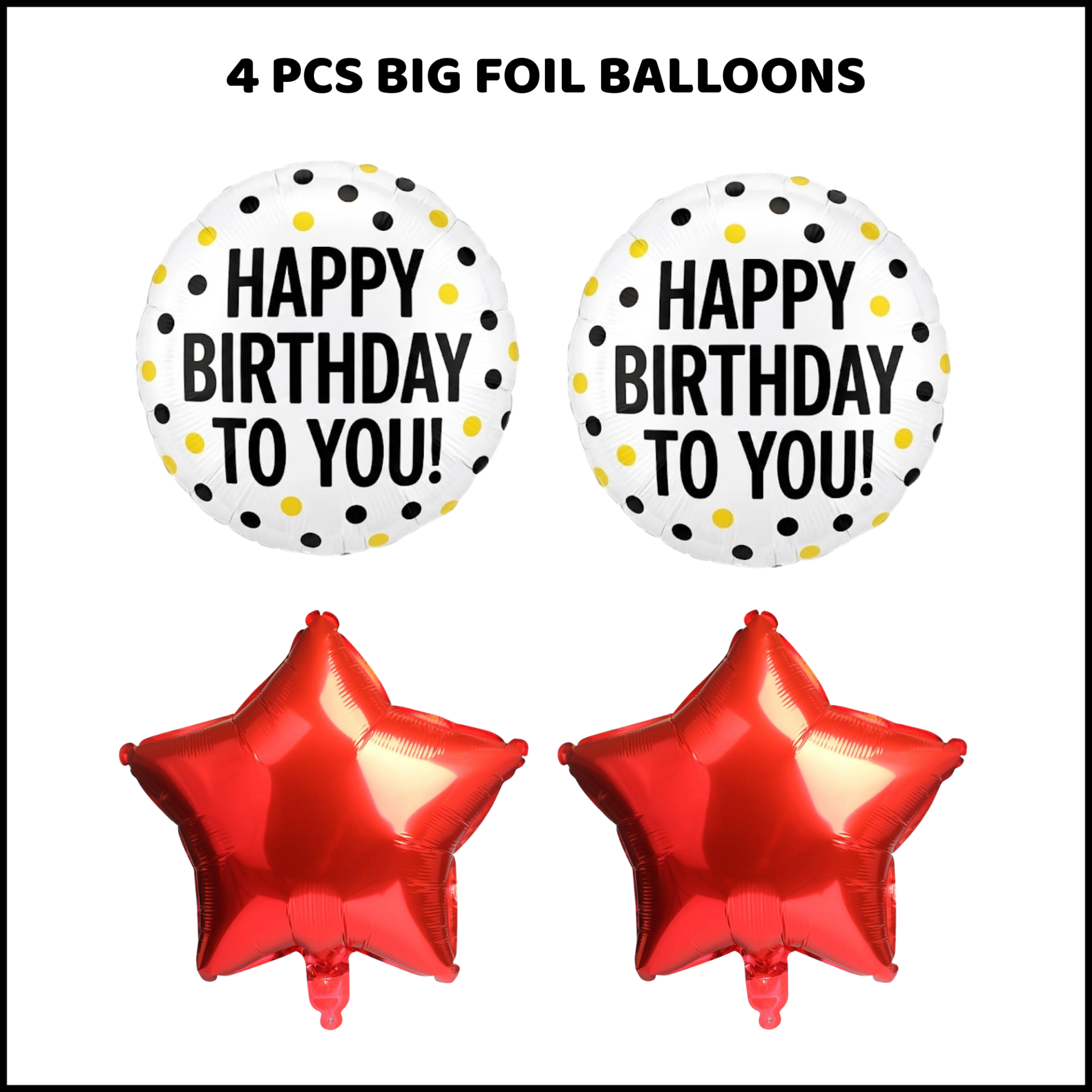 Golden star foil balloons add sparkle, while the Happy Birthday banner, confetti balloons, and big foil balloons complete the decoration. Fun accessories like birthday caps, birthday goggles, birthday sash, LED cork lights, curl candles, and party poppers make the celebration lively and interactive.