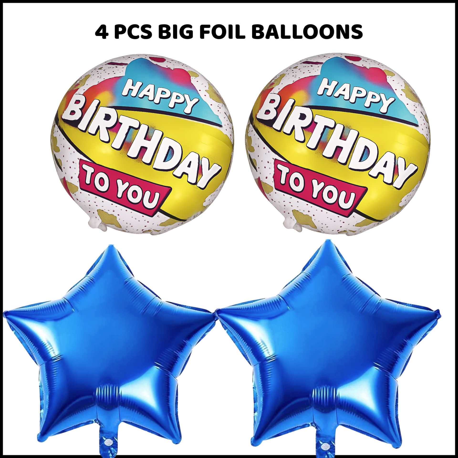 This premium decoration combo includes balloons, foil curtains, star foils, a cute character foil balloon, banner, confetti balloons, lights, party accessories, and installation tools — everything you need in one box.