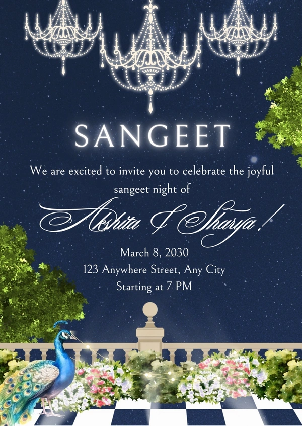 Royal Night Theme Sangeet Invitation Card with Chandeliers & Peacock Illustration