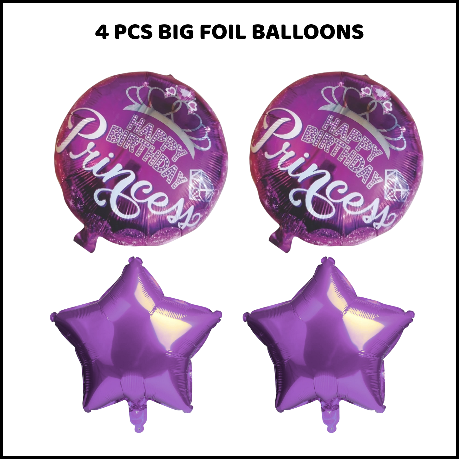 This premium DIY decoration set includes balloons, foil curtains, star foils, princess character foil balloon, banner, confetti balloons, lights, and party accessories—everything needed for a complete, professional-looking setup.