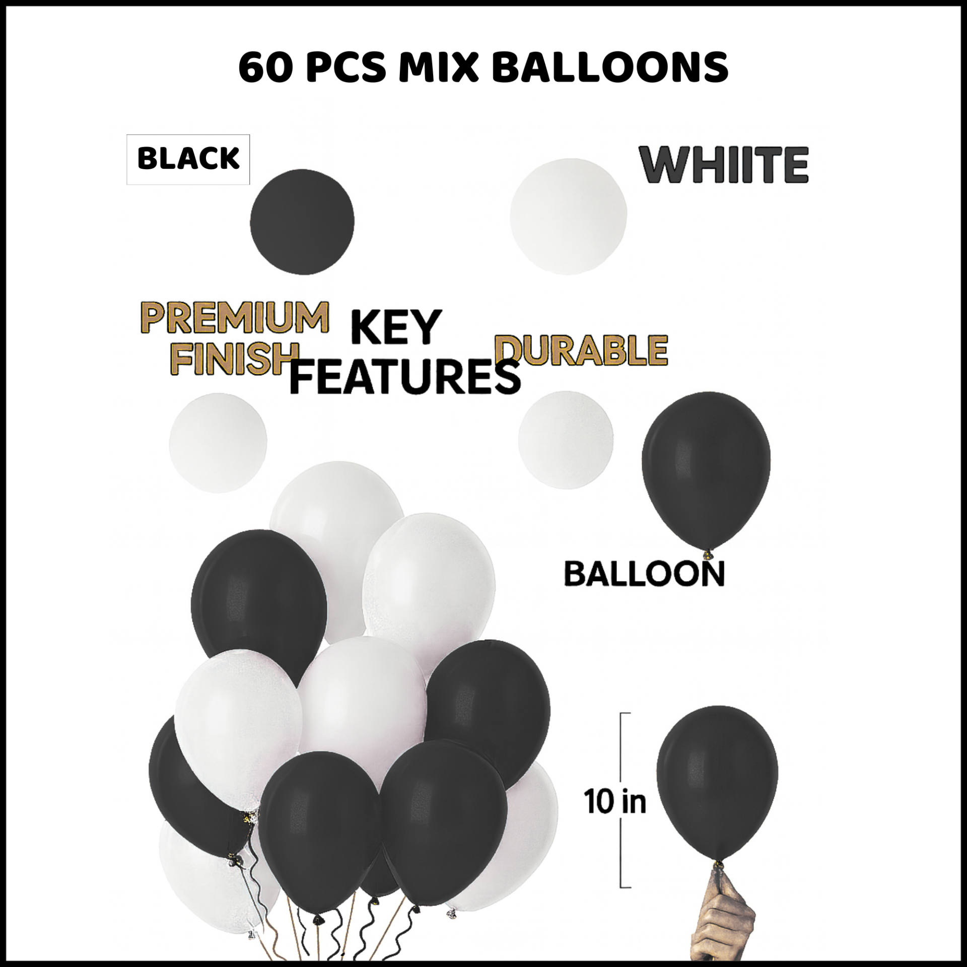 Inspired by the attached image, this beautifully designed party combo includes everything you need to create a professional, premium monochrome birthday backdrop at home—perfect for men, women, couples, teens, and stylish birthday celebrations.